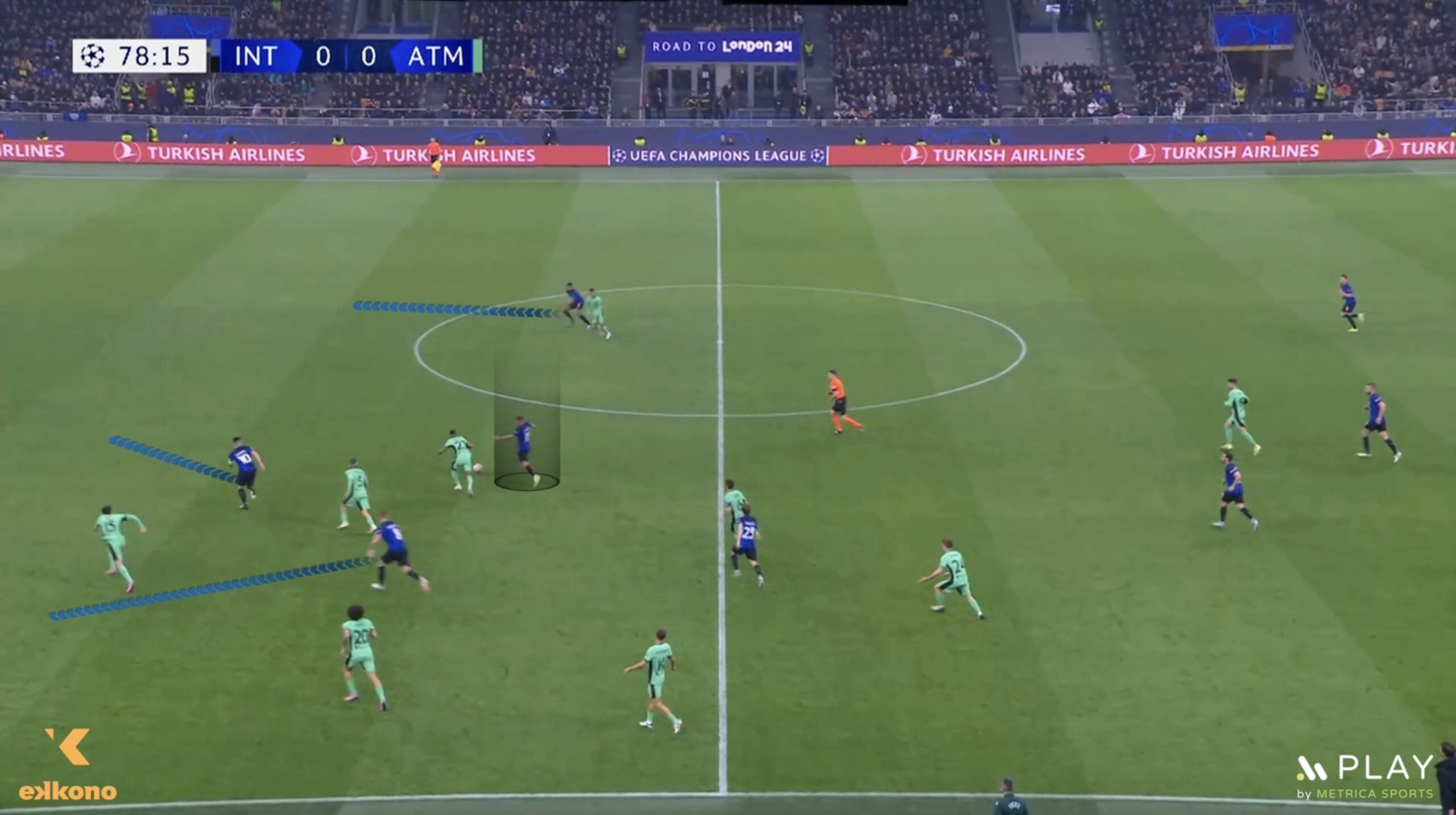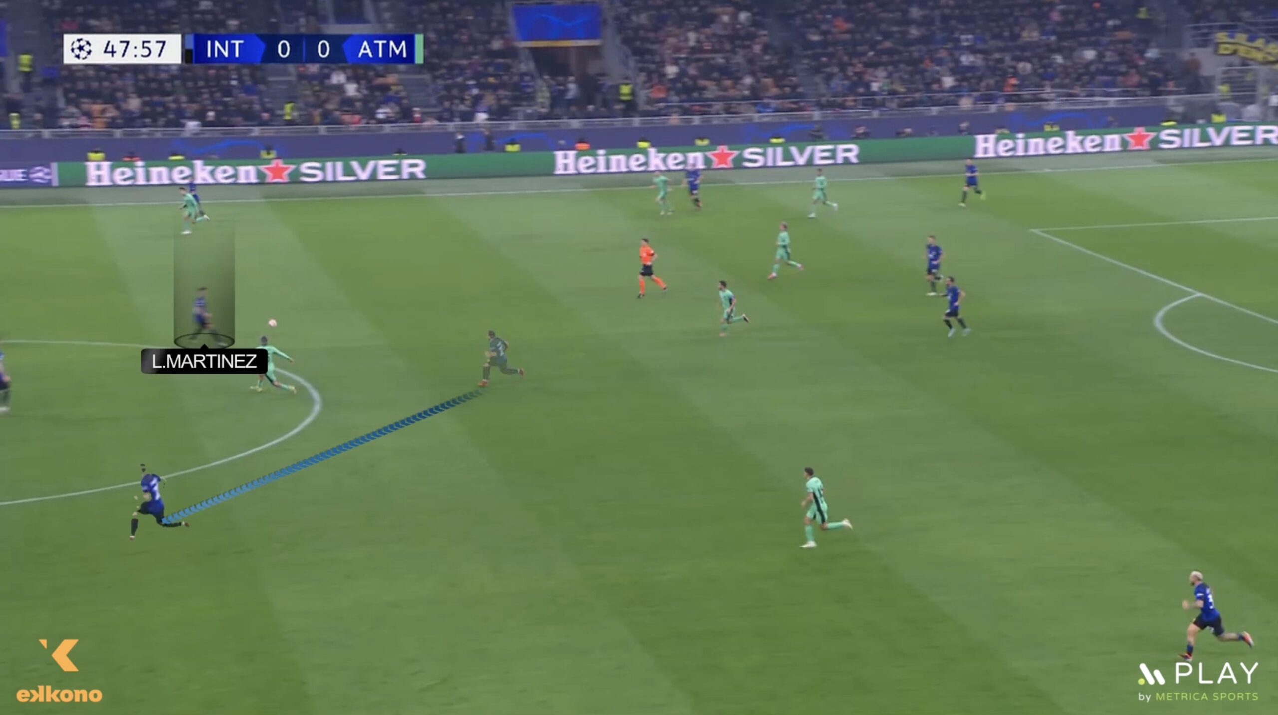 Additionally, in this situation, if the defender does not come out to press him, Lautaro has the ability to quickly identify the situation and turn to generate danger vertically. This ability to adapt and read the game is one of the key strengths of Inter Milano in their tactical system.