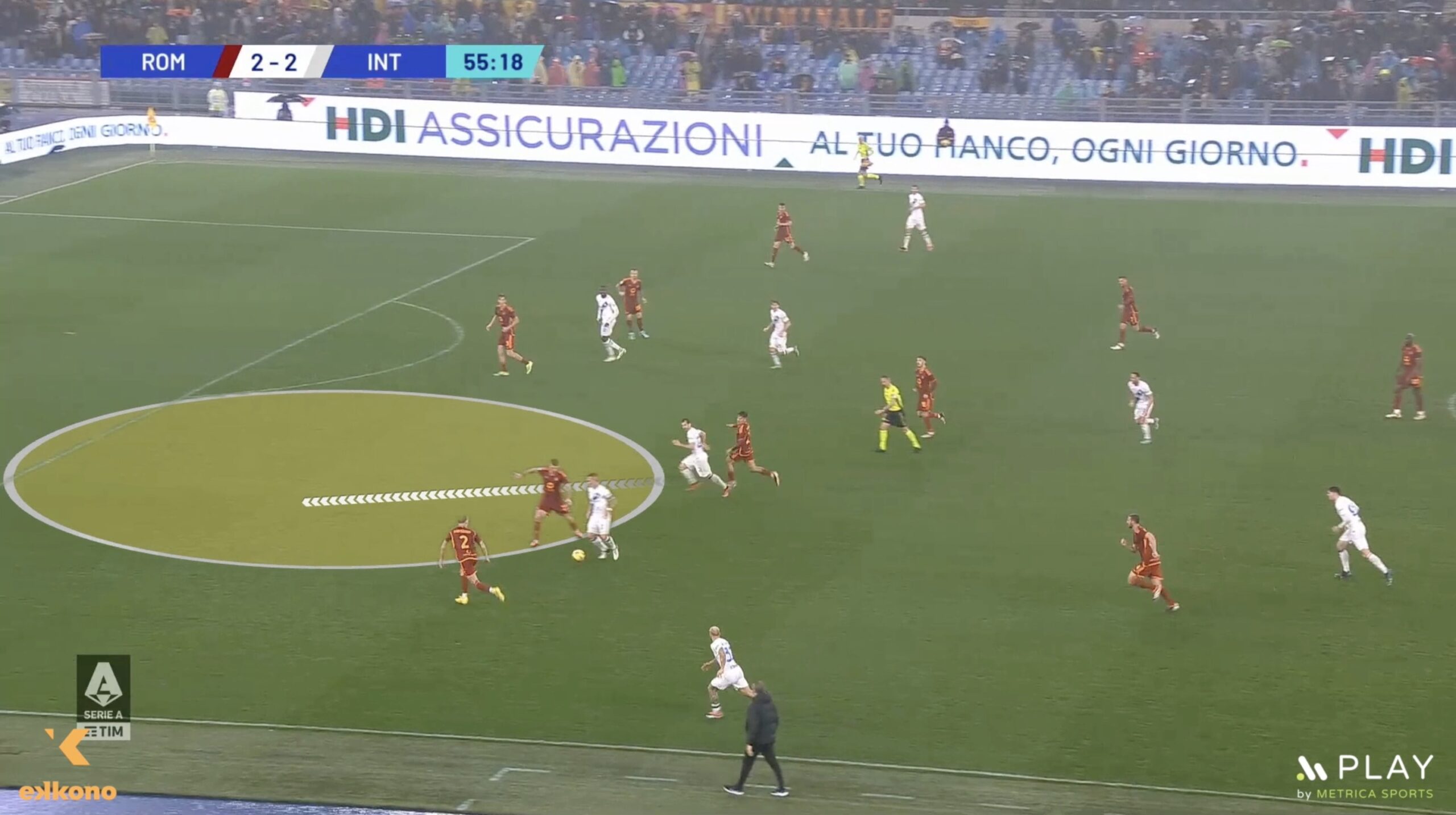 In this semi-open recovery, we can see Bastoni (CB) attacking the left channel, acting as a winger. This is a clear principle of Inter, with players moving forward aggressively in transition, regardless of their position.